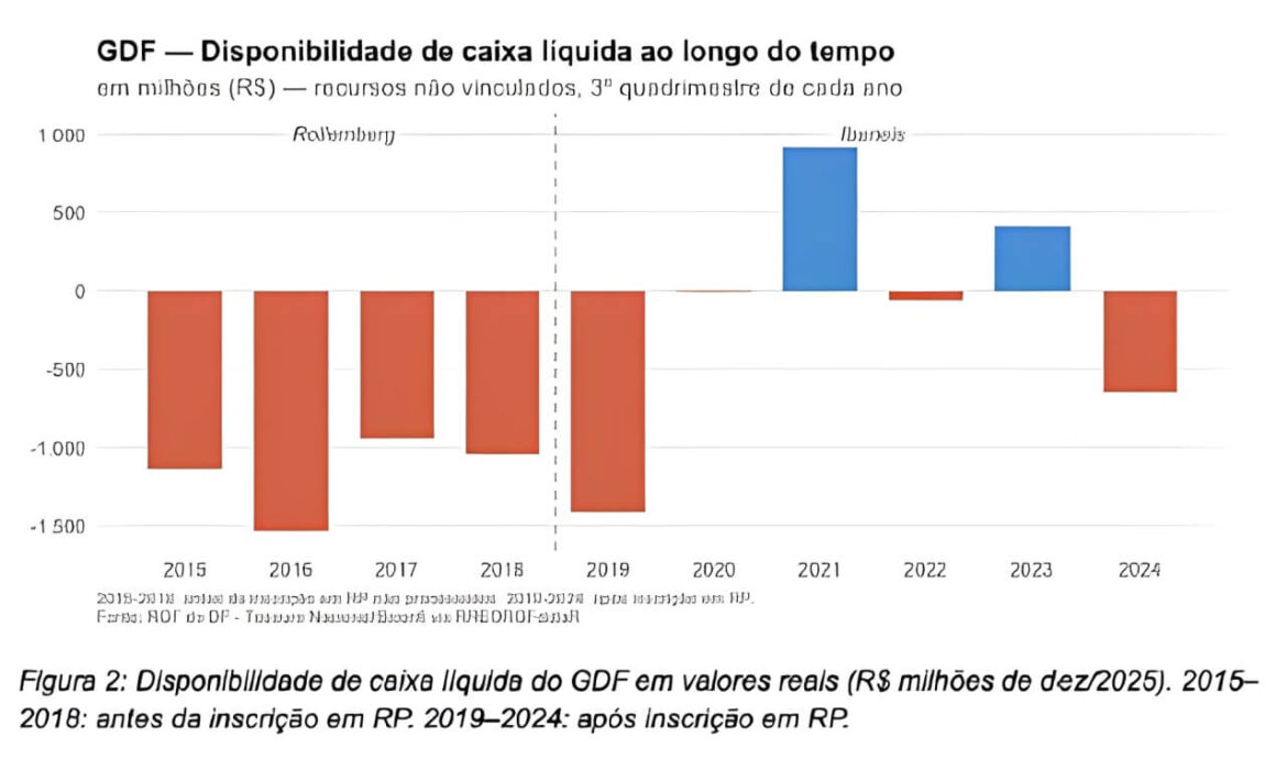 Essa situação não é nova. Entre 2015 e 2018 (governo Rollemberg), o caixa ficou negativo de forma contínua. De 2019 a 2024 (Governo Ibaneis Rocha), houve momentos de melhora, especialmente em 2021 e 2023, mas sem uma trajetória consistente.