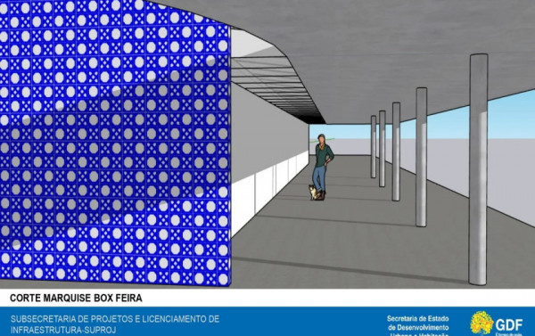 Na área da praça de alimentação, as marquises serão ampliadas até 10 metros de distância, permitindo a instalação de mesas e bancos para maior comodidade dos frequentadores. O vão central da praça receberá um grande pergolado metálico, destinado à realização de eventos culturais aos finais de semana, fortalecendo o papel da feira como ponto de encontro e expressão artística.